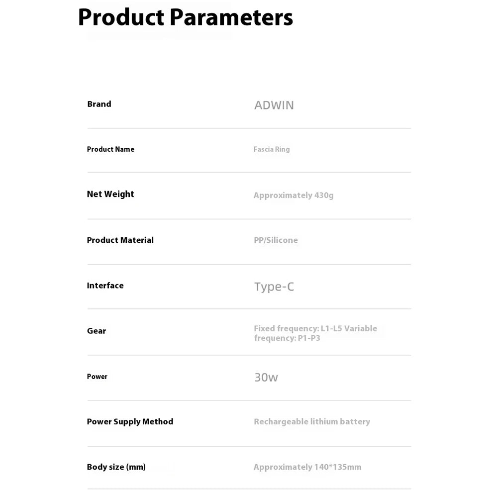 | Full-Body Fascia Ring Multifunctional with 5 Modes Deep Tissue Massage Gun Percussion Muscle Massager Vibration Fascial Ring for Home Gym Use Features: 1.Deep Tissue Relief: The handheld fascial ring offers deep tissue massage that conforms to body contours, providing soothing relief for legs, back, waist, and shoulders, making it an excellent choice for those seeking targeted relaxation. 2.Five Intensity Modes: Choose from 5 adjustable vibration intensities with this percussion muscle massager, allowing users to customize the electric massager to suit specific muscle needs across various body parts. 3.Ergonomic Design: The back vibration fascial ring features an ergonomic ring design with a vibrating function and a clear LED screen for easy parameter adjustments, enhancing user experience and convenience. 4.Rechargeable On-the-Go: This electric massager is easily rechargeable and wireless, with a simple button to select your preferred mode, for home, gym, or travel use. 5.Multi-Purpose Application: Designed for versatility, this device targets multiple body areas, including abs, waist, hips, arms, legs, and back, offering comprehensive care. Specification: Origin: Mainland China Main Material: PP/Silicone Product Size: 140.00x135.00mm/5.51x5.31inch Note: |